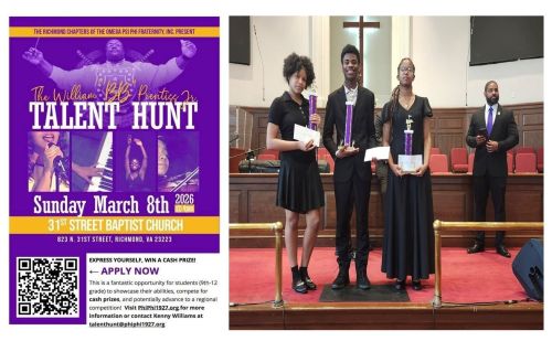 The Richmond area Chapters of Omega Psi Fraternity Inc. sponsor the Annual Talent Hunt Program at 31St. Street Baptist Church.  The Talent Hunt Program encourages Richmond area high school youth to display their talents in the areas of music, art and oratorical talents.  The participants are evaluated by judges and winners are eligible to compete for additional awards at our District and International Conclave events. The Graduate Chapters of Phi Phi and Upsilon Nu, as well as the Undergraduate Chapters of Zeta (Virginia Union Univ.) and Phi Delta (Virginia Commonwealth Univ.) coordinate the yearly event.  For 2026 the winners included